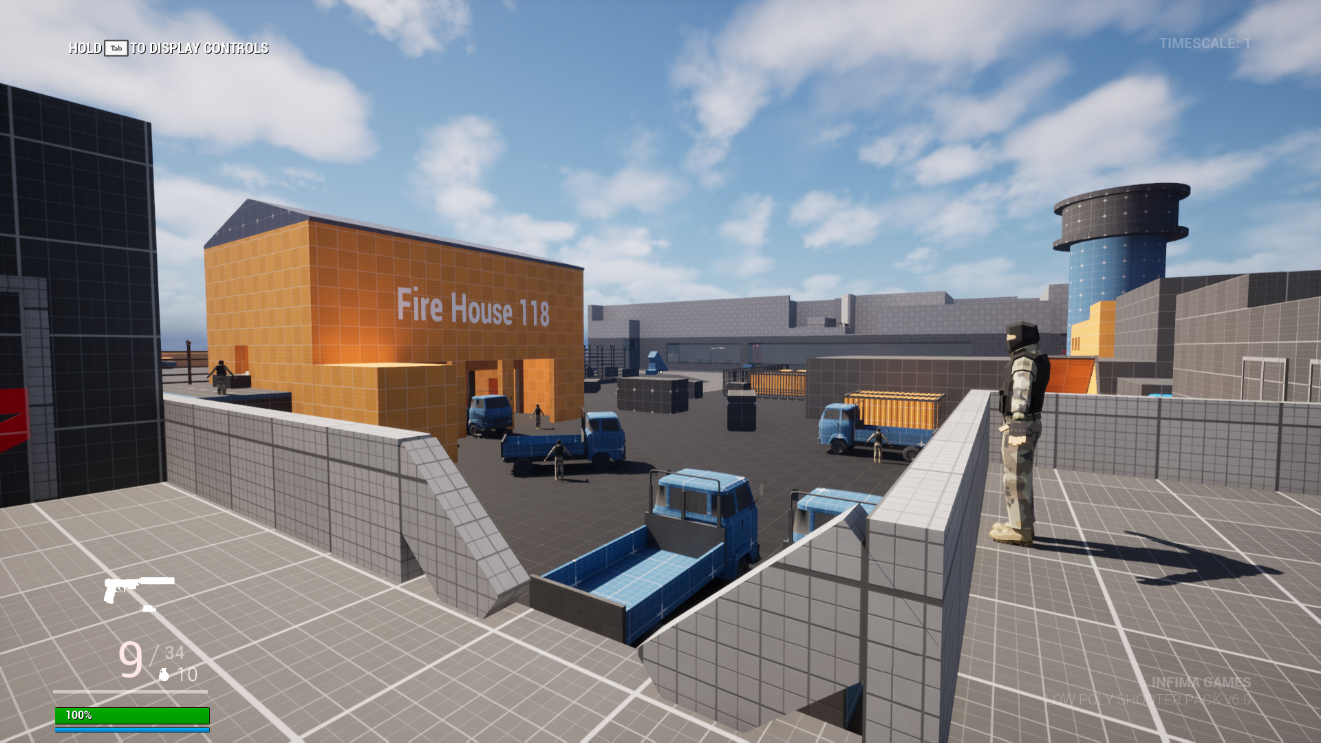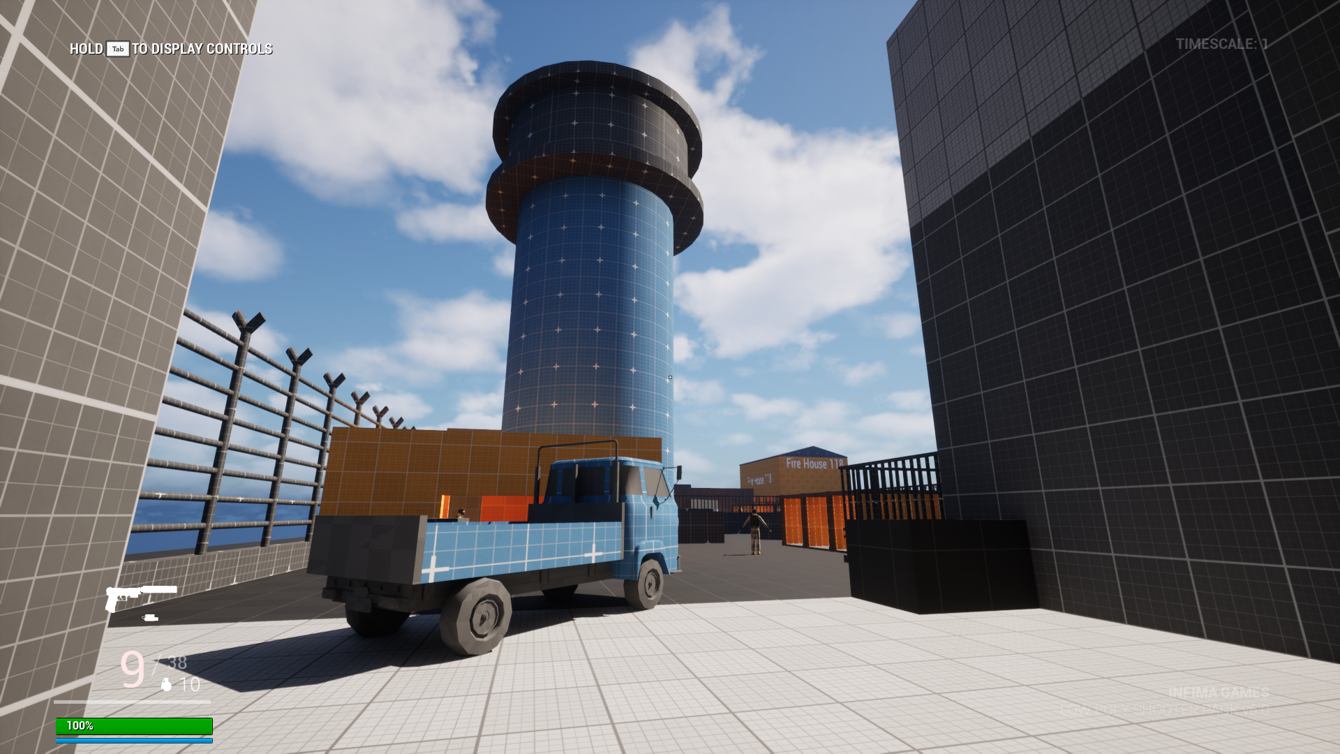 Utilizing one way drops and leading lines with geo, players are guided forward towards their next objective. As they approach the Fire House a container falls and blocks their path which then leads them to an alterante path. I designed this to increase tension and help further push story telling through gameplay.